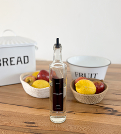 Aceitera cilindrica transparente con etiqueta Aceitera de vidrio con pico vertedor Medidas: 29 cm alto x 7 cm diam (base)
